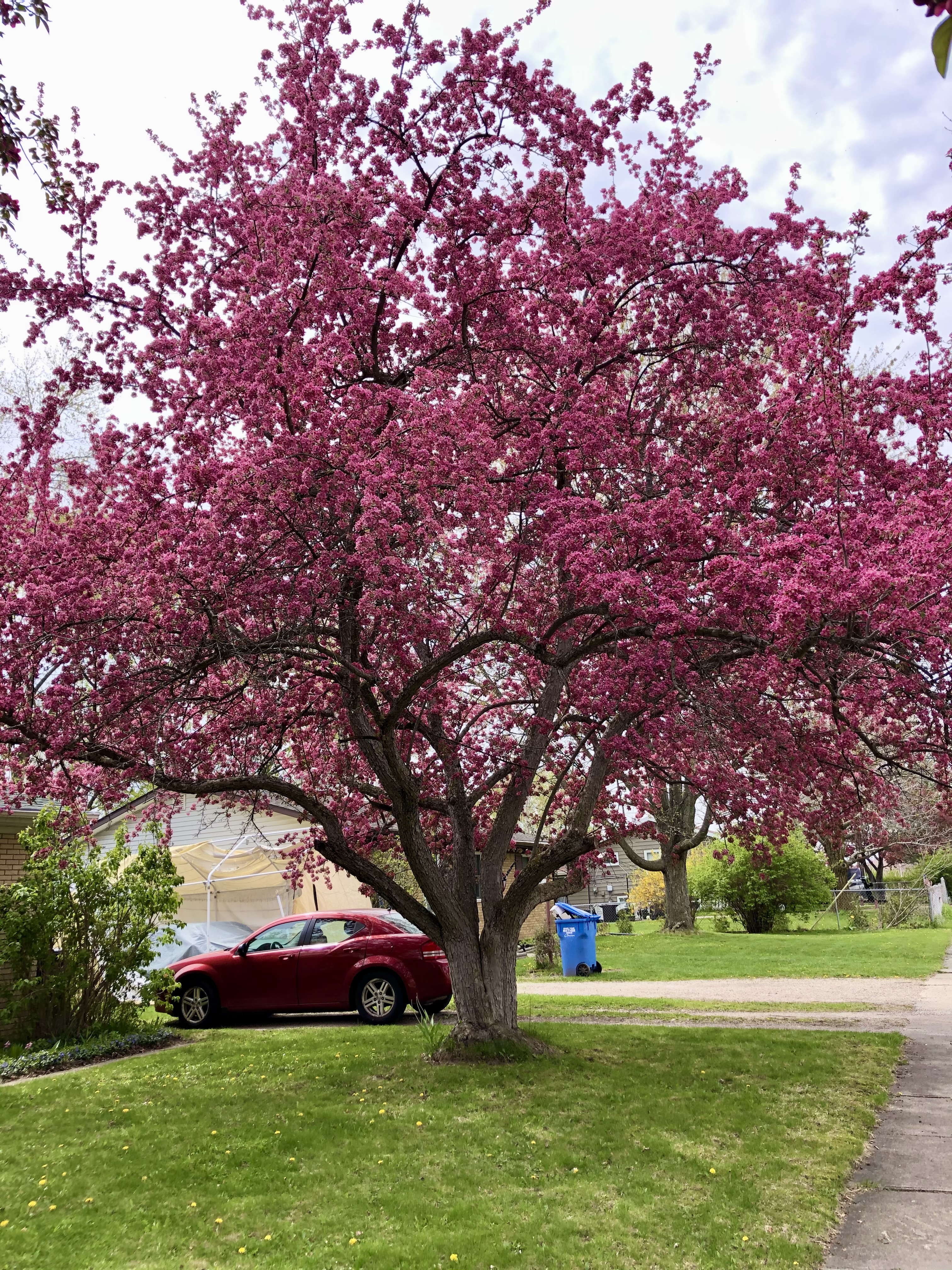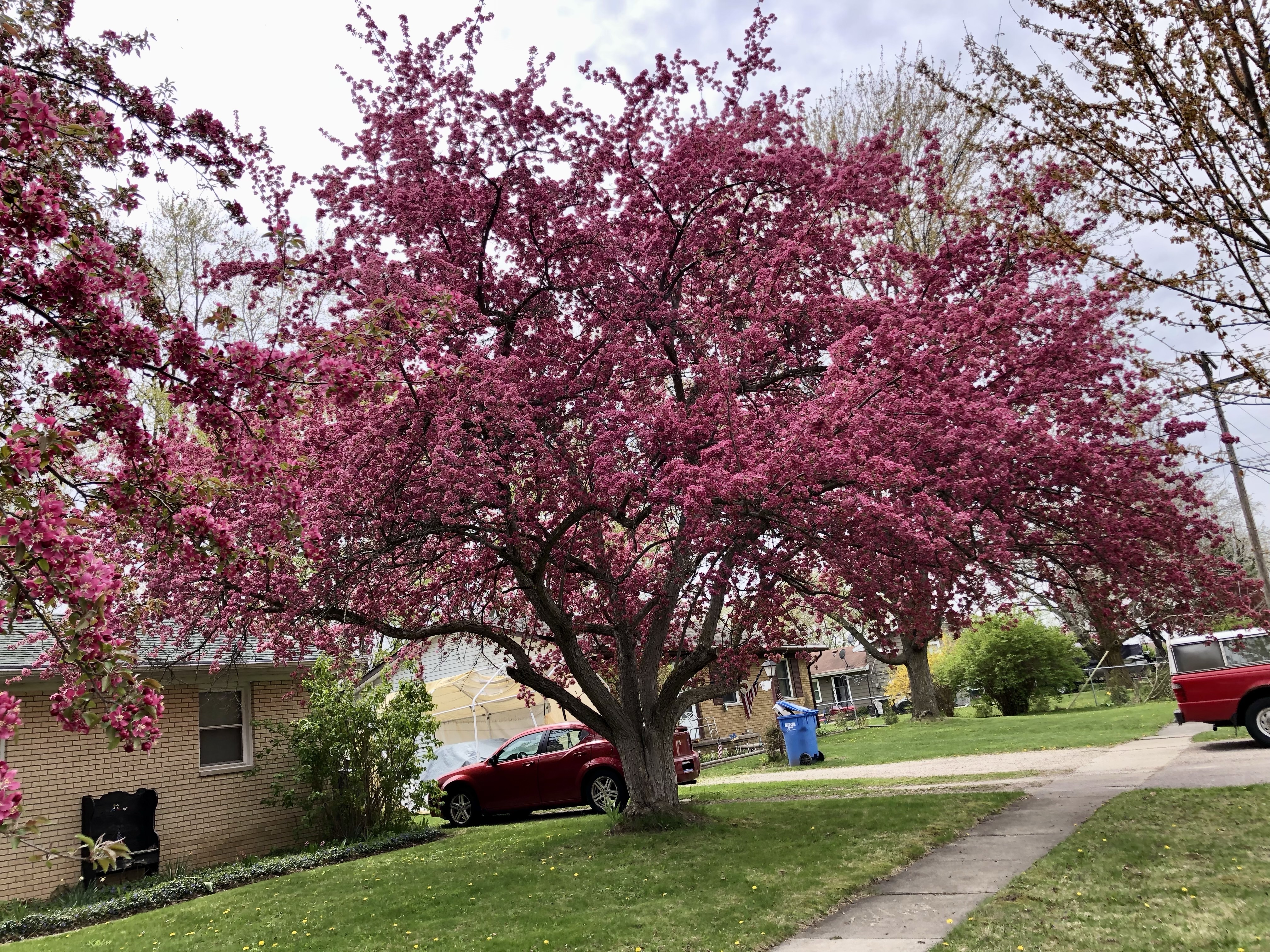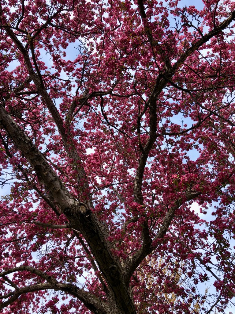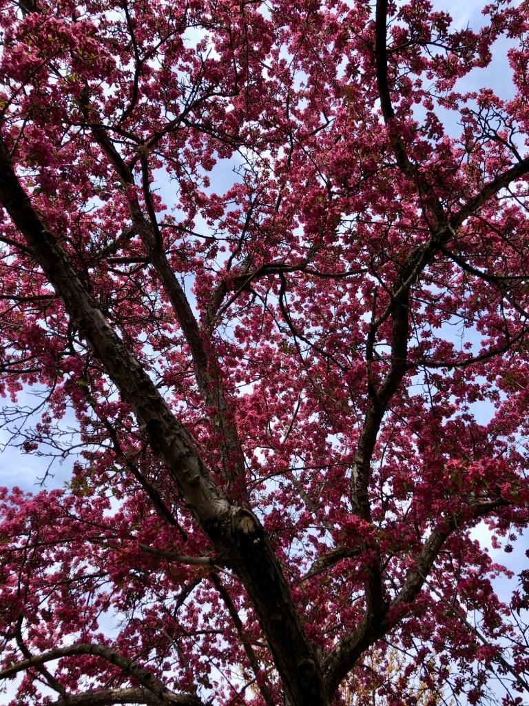 These moments in early spring used to be beyond spectacular, so much more incredible even than it was here (April 2021). This crabapple in particular is still quite striking, despite its many legitimate grievances; its mate across the front yard, whose furthest ends you can see to the left in the photo just above, is not doing nearly as well. It is actually rapidly falling apart, quite literally.