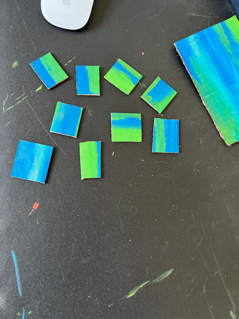 I just solved two issues: (1) what to do with the stack of painted cardboard that haven’t led to anything (an Island of Misfit Cardboard Art!), and (2) what to do about tiles for mosaic art, which I had already been thinking about when a good friend of mine randomly suggested it—a confirmatory coincidence, if you will.