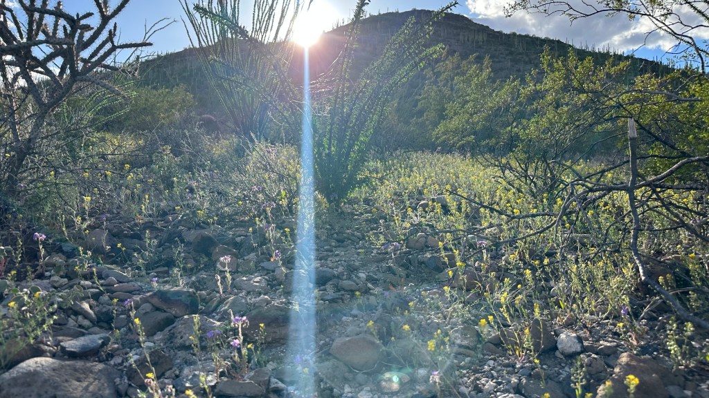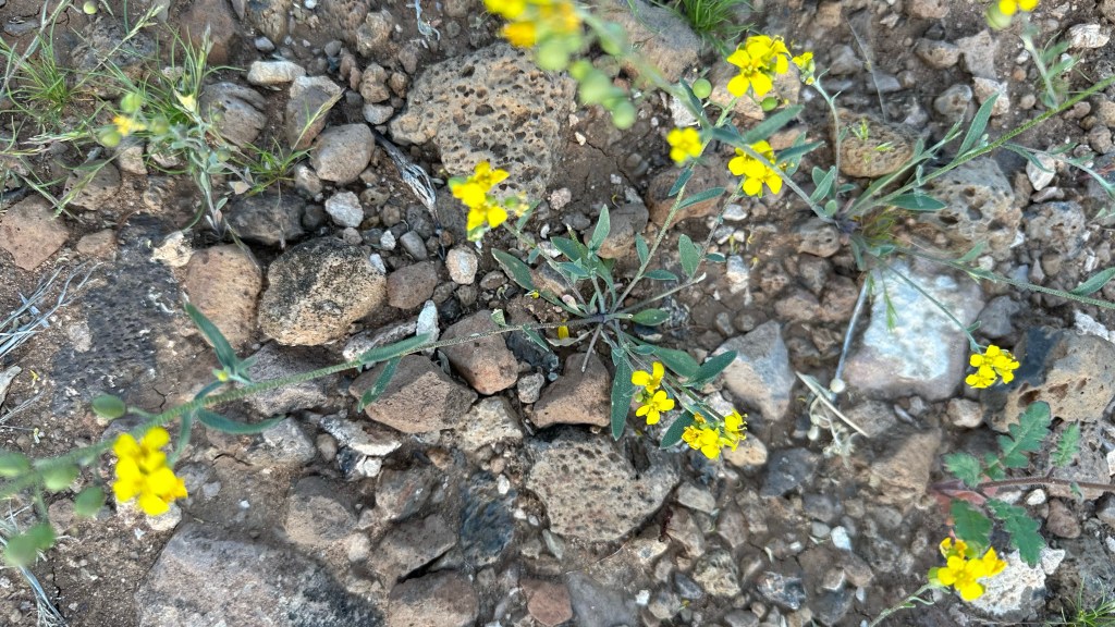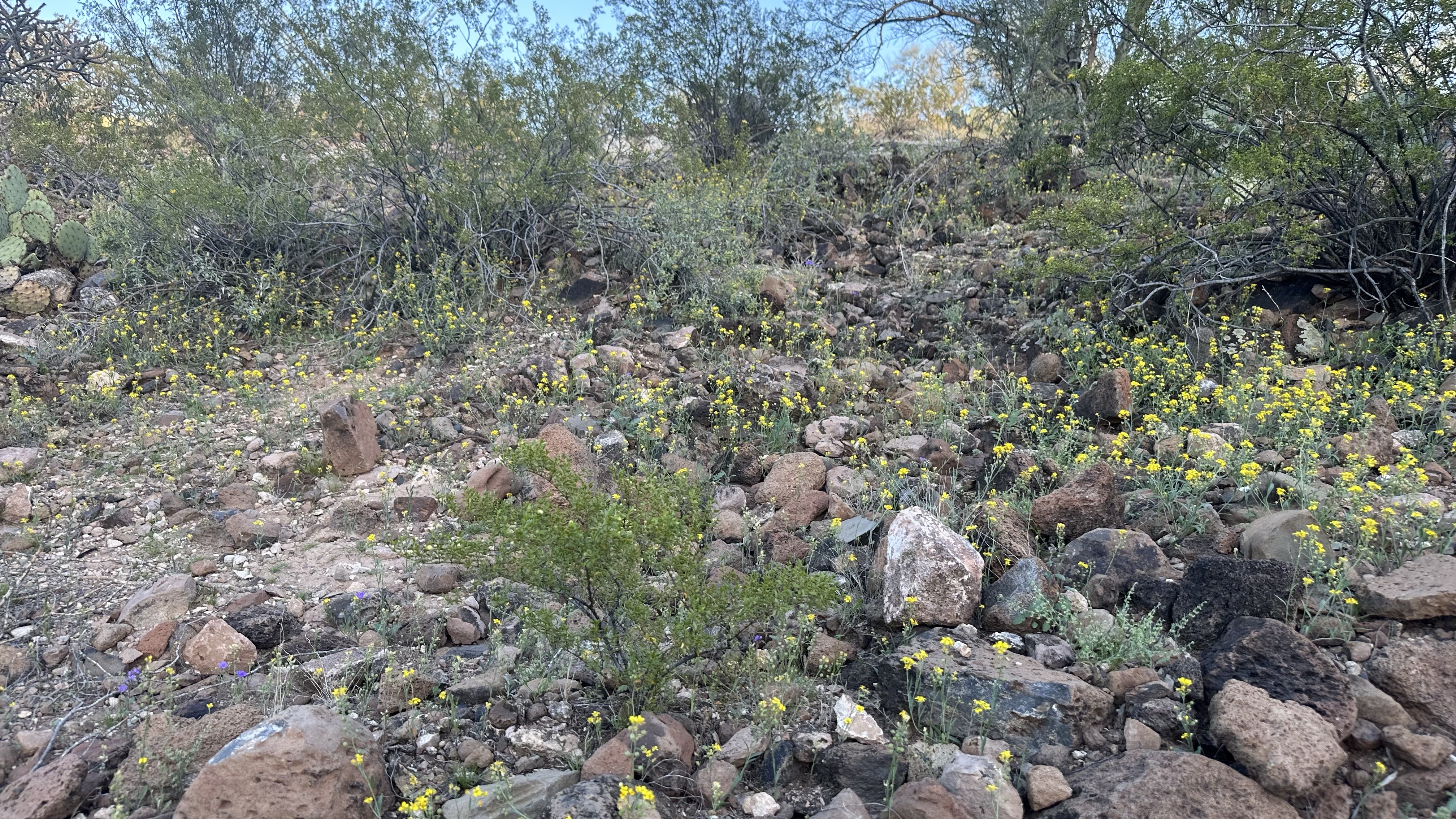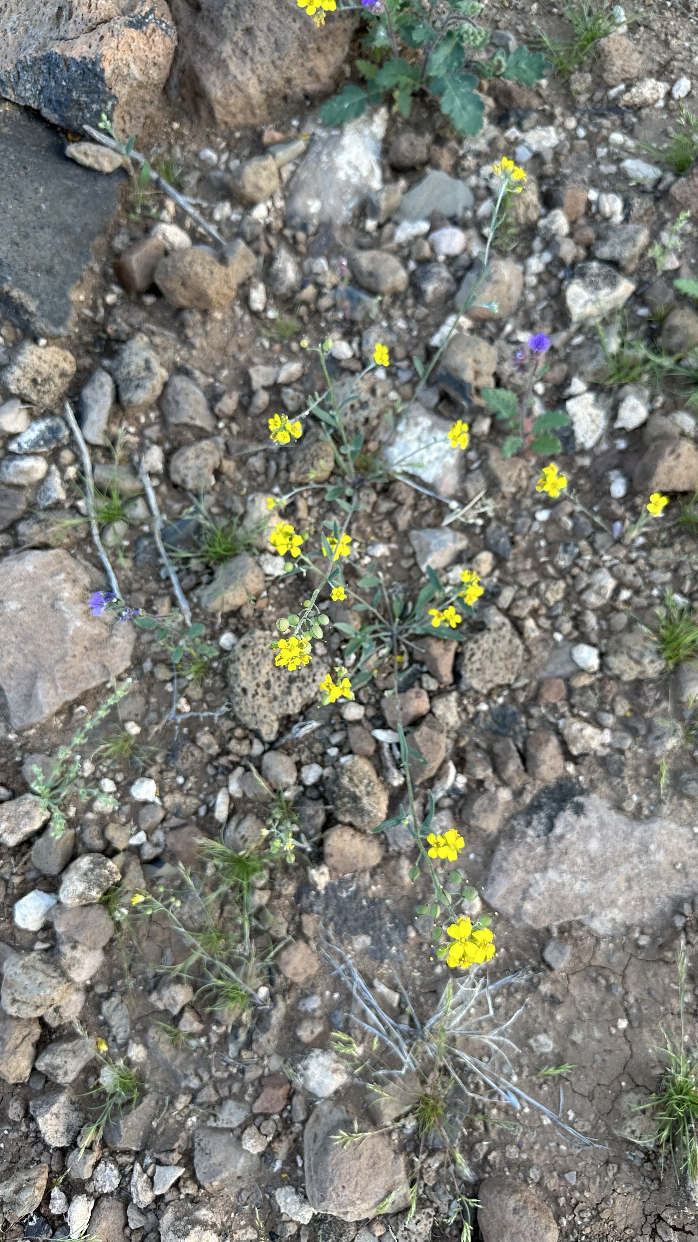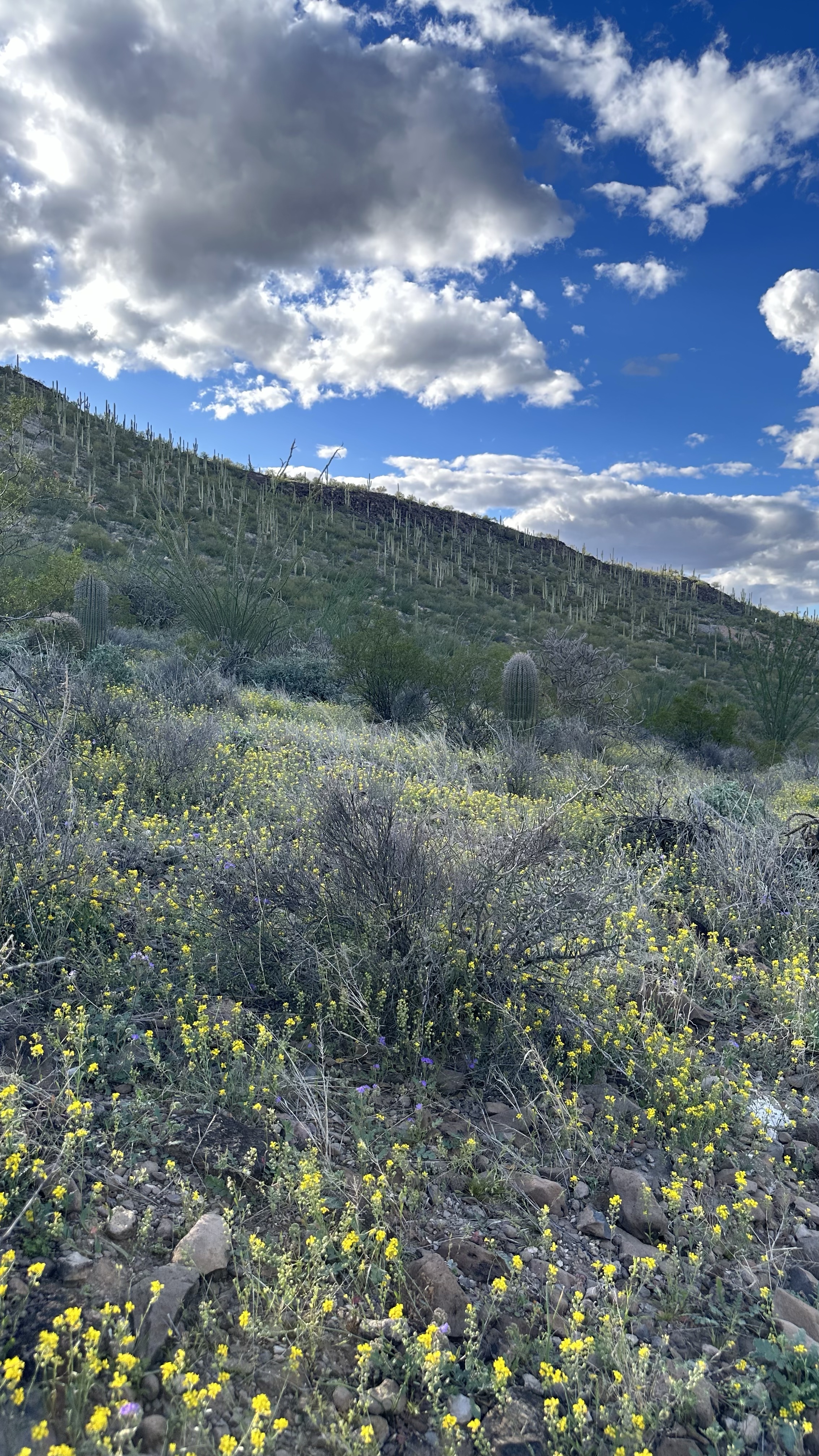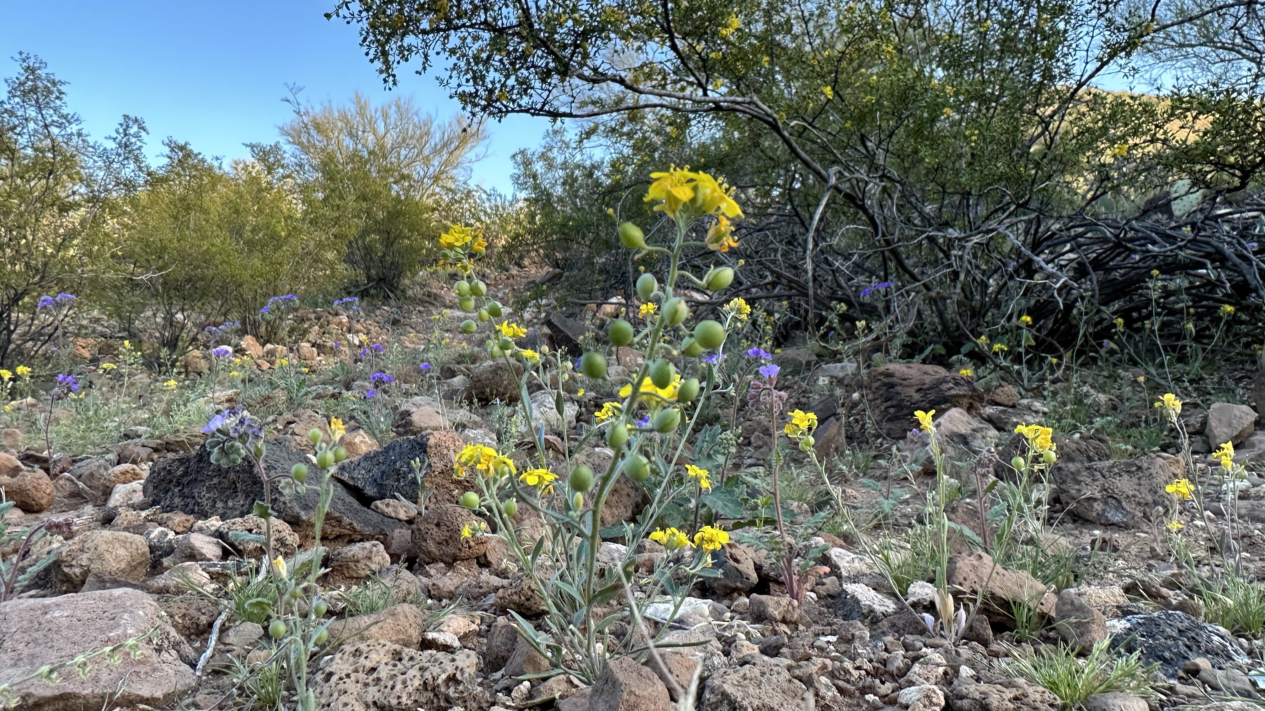 What an astonishing show being put on in the Sonoran Desert right now! An explosion of yellow (Gordon’s Bladderpod [link to swbiodiversity.org]), punctuated by a purplish flower (Phacelia distans(?) or else Phacelia crenulata(?) [both links to Lady Bird Johnson Wildflower Center]), all the more precious for its sparing presence.