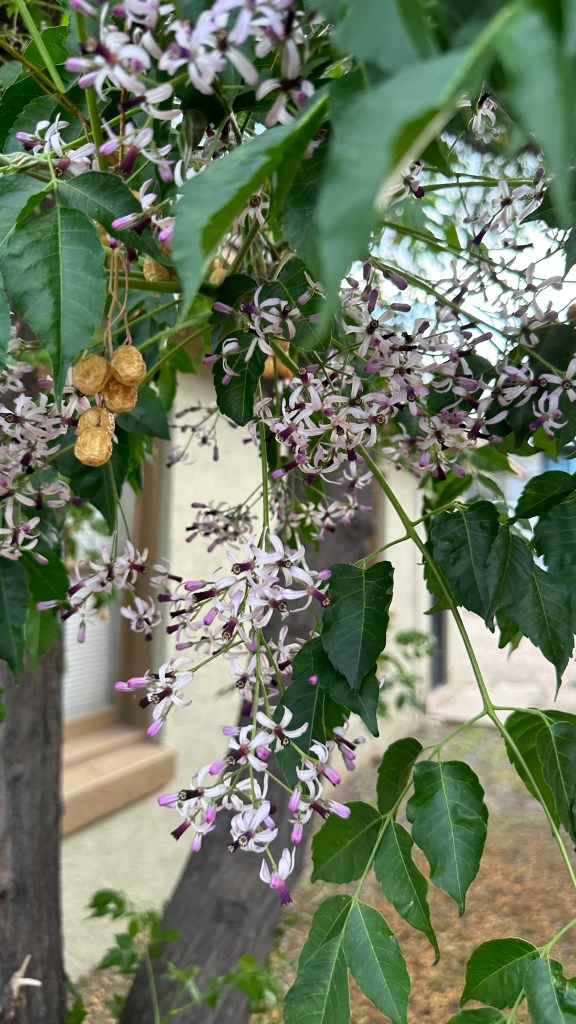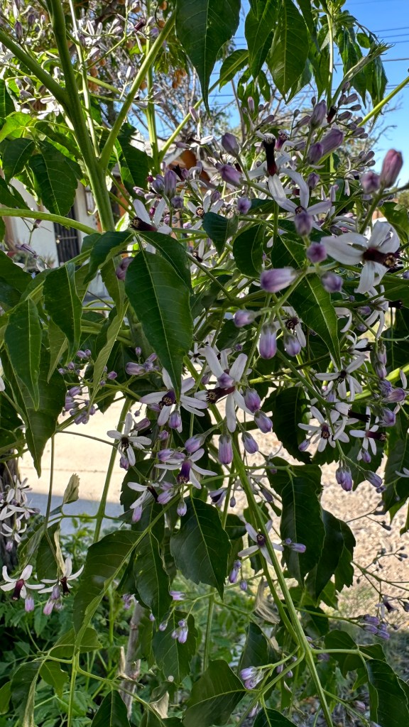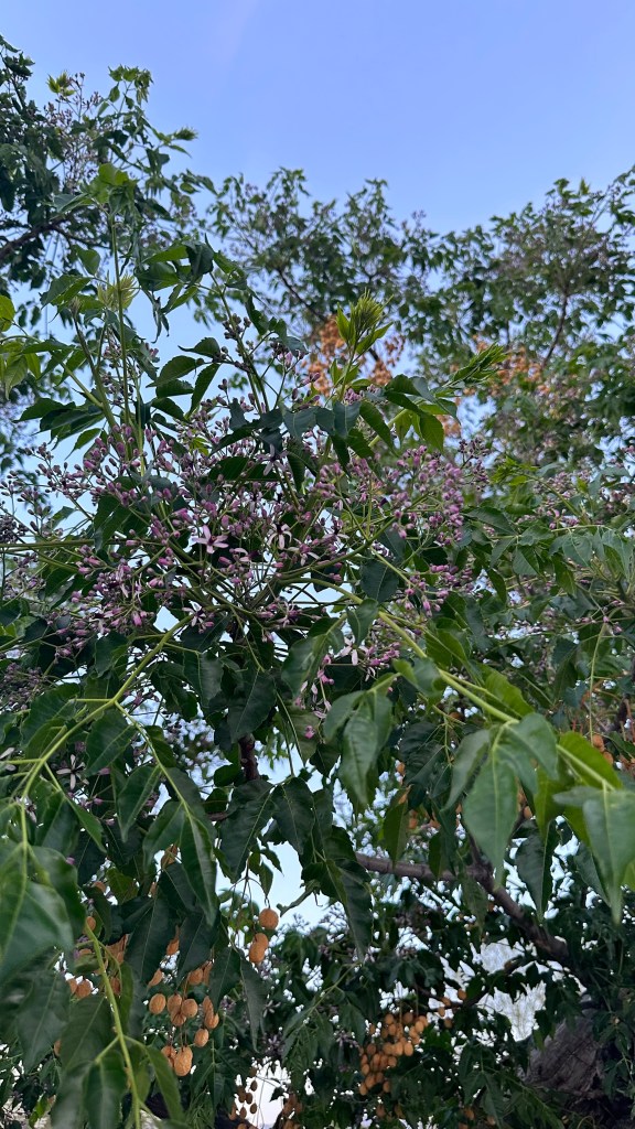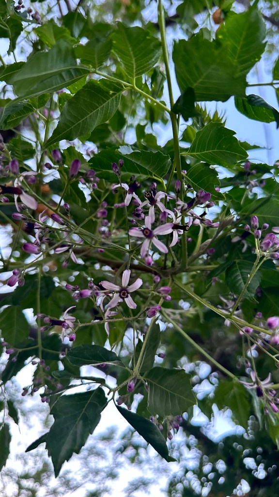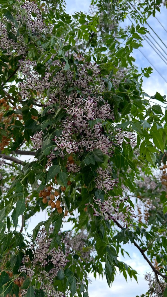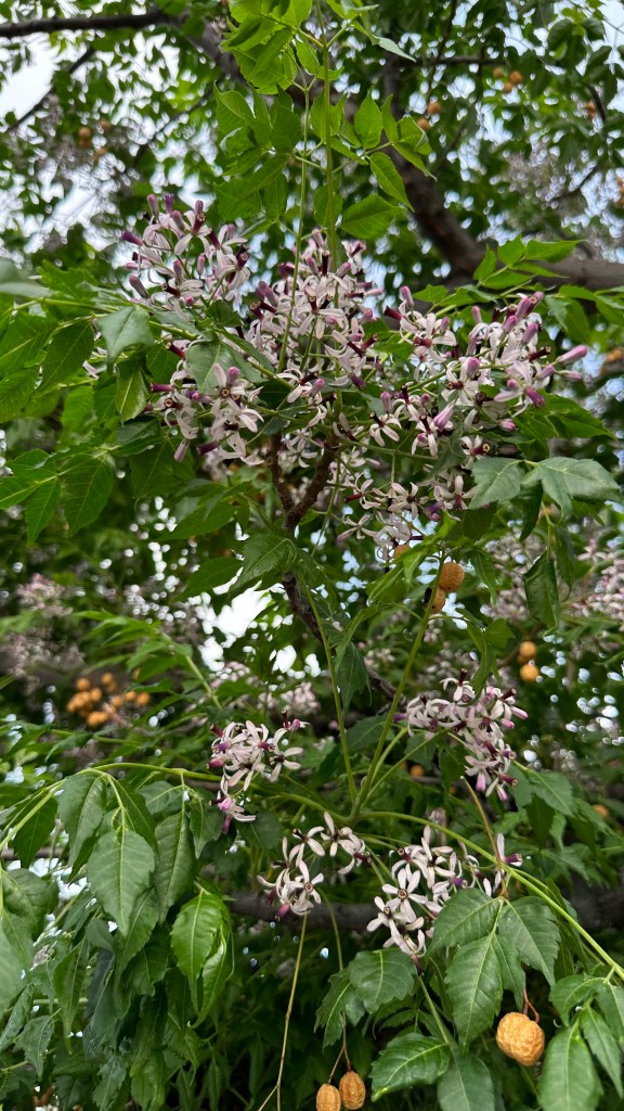 Melia azedarach, introduced to North America in the 1830s on the East Coast. [Link to Wikipedia] They’re not native, but their fragrance is amazing: it smell exactly like a cologne/perfume, with that same artificial chemical smell underlying a broadly floral fragrance, sweet but powerful.