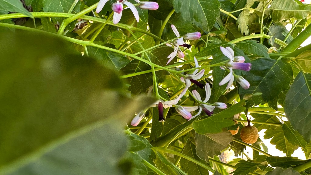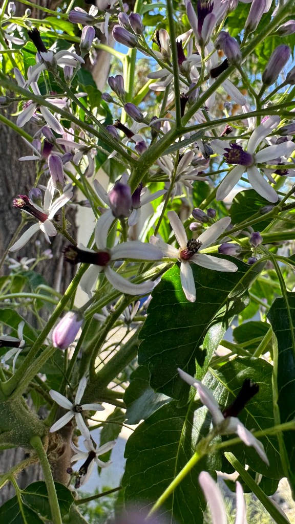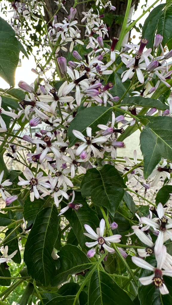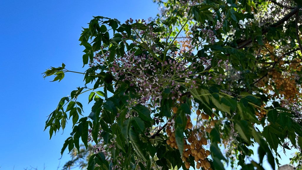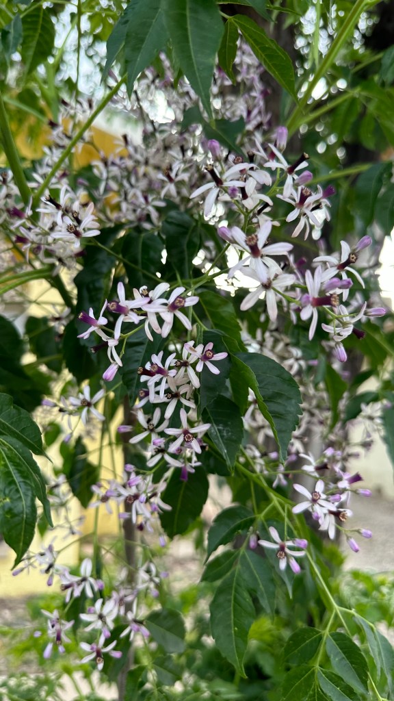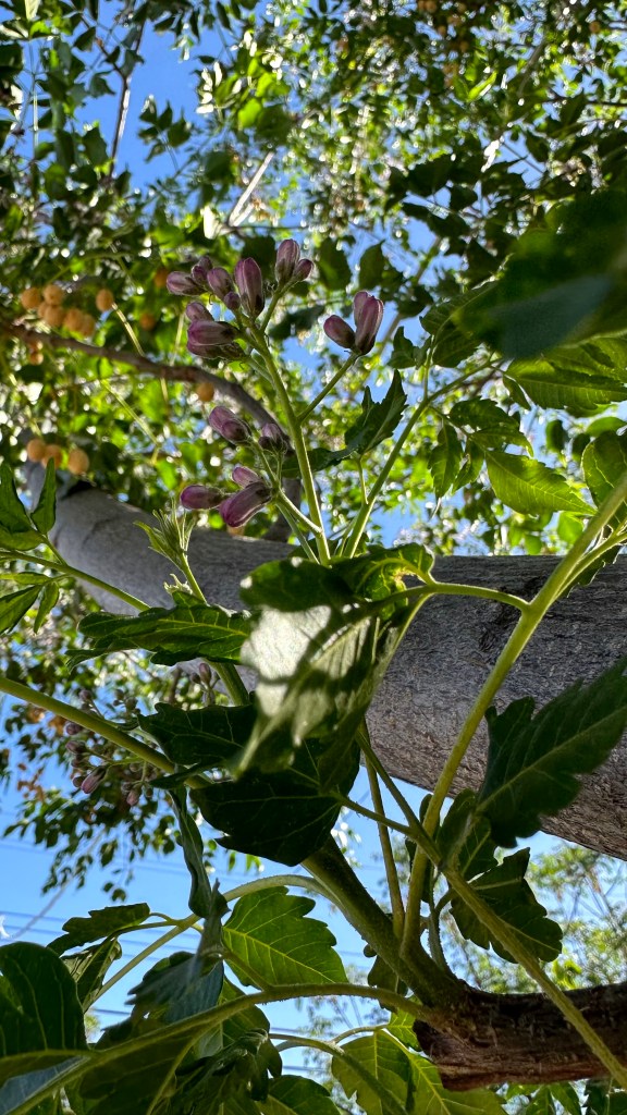 Melia azedarach, introduced to North America in the 1830s on the East Coast. [Link to Wikipedia] They’re not native, but their fragrance is amazing: it smell exactly like a cologne/perfume, with that same artificial chemical smell underlying a broadly floral fragrance, sweet but powerful.