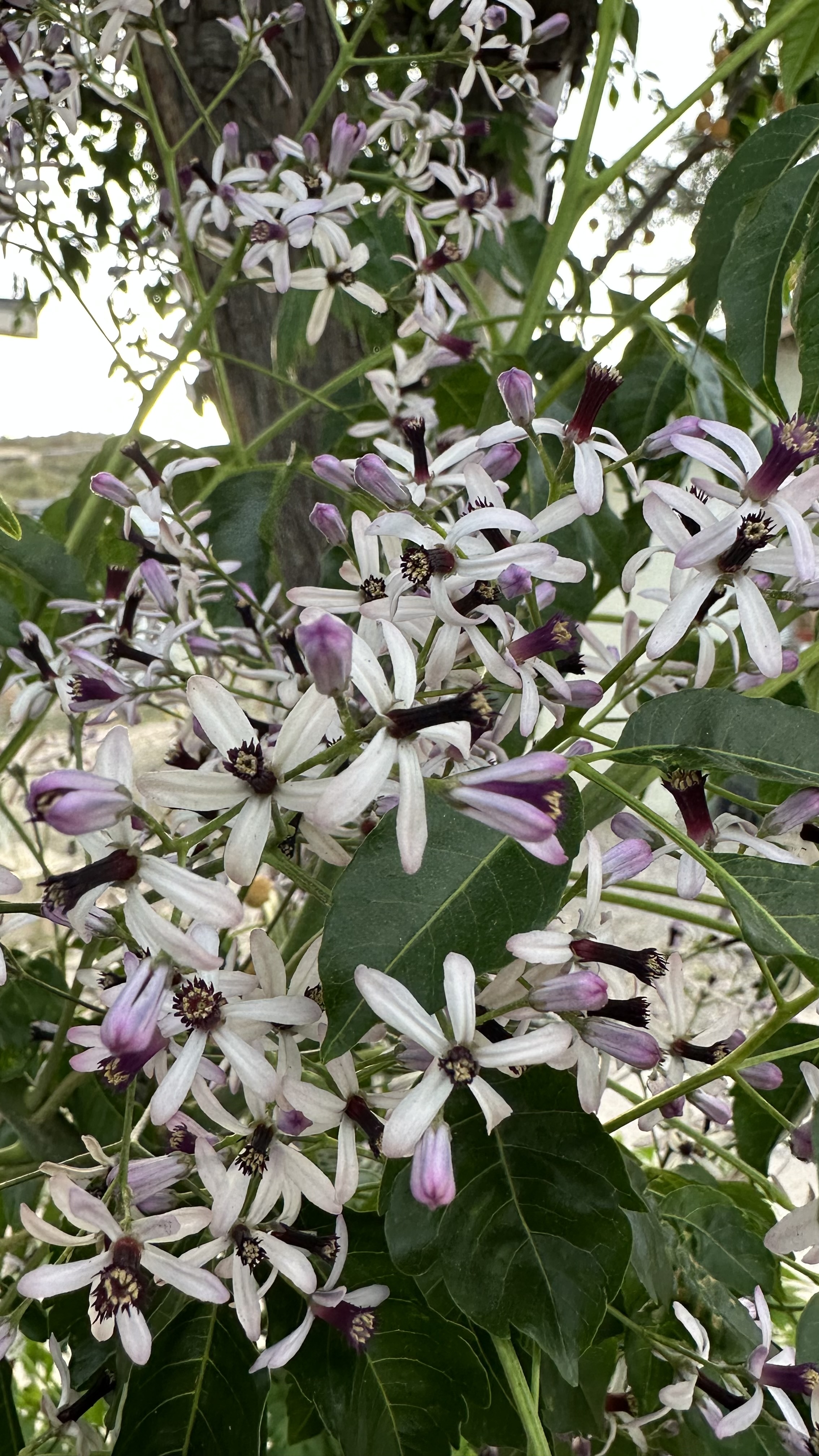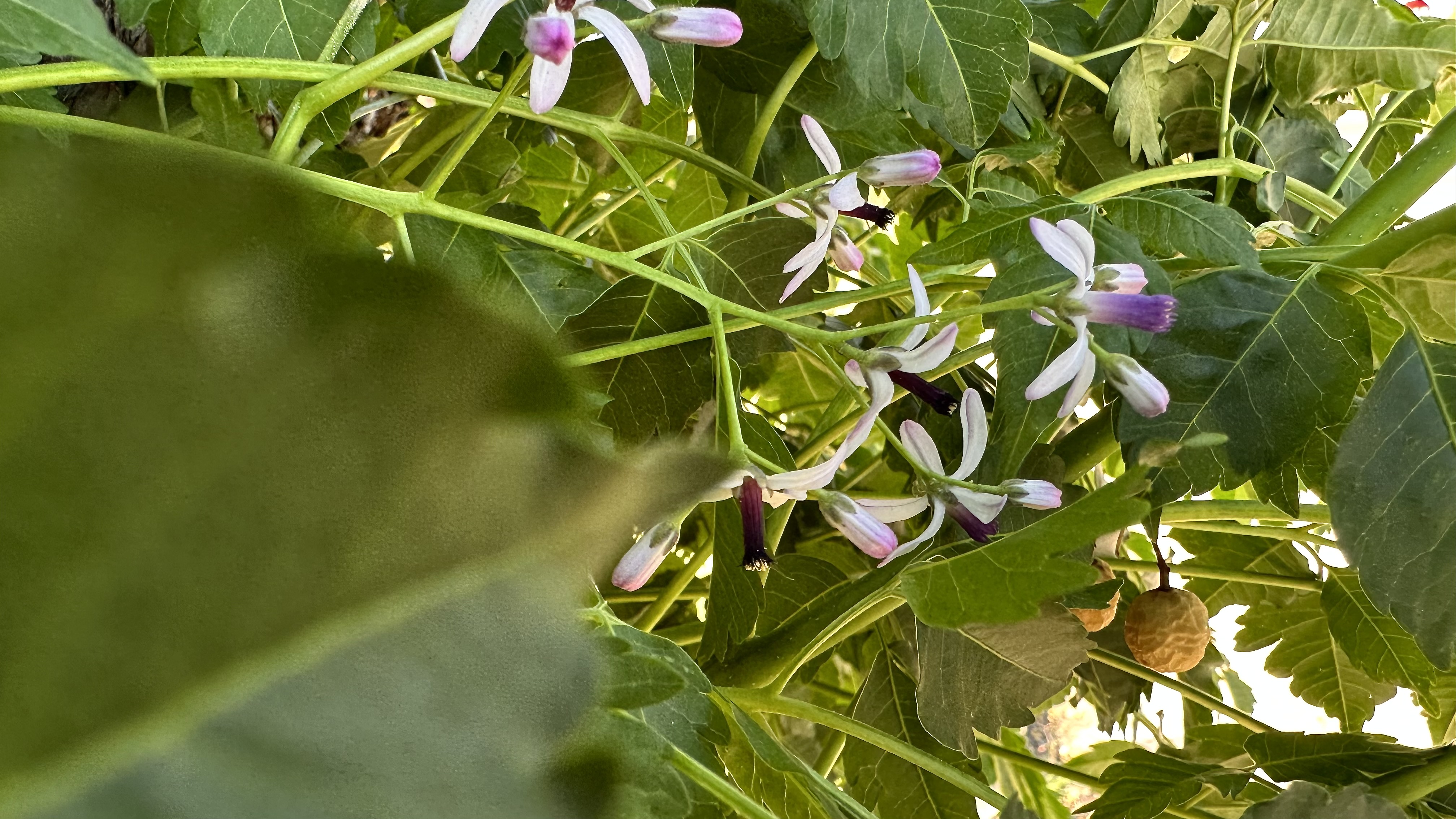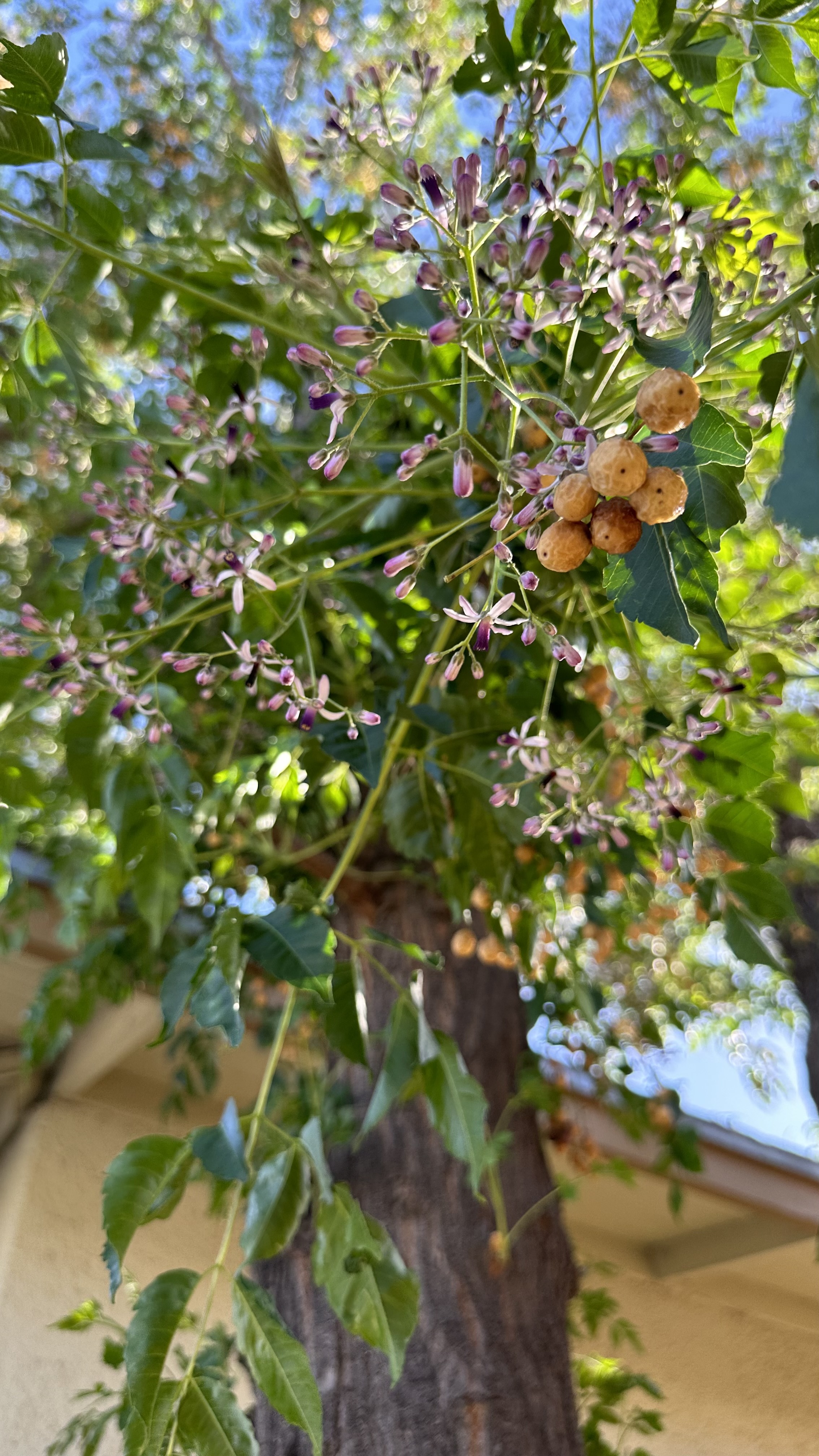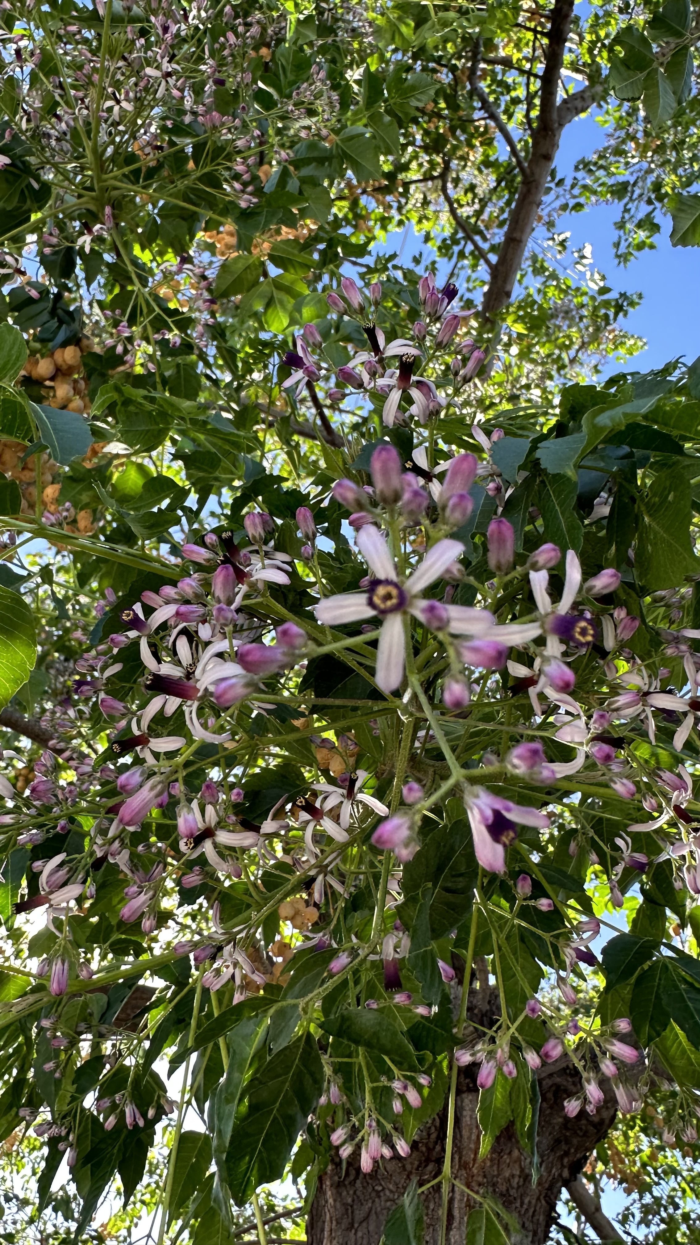 Melia azedarach, introduced to North America in the 1830s on the East Coast. [Link to Wikipedia] They’re not native, but their fragrance is amazing: it smell exactly like a cologne/perfume, with that same artificial chemical smell underlying a broadly floral fragrance, sweet but powerful.
