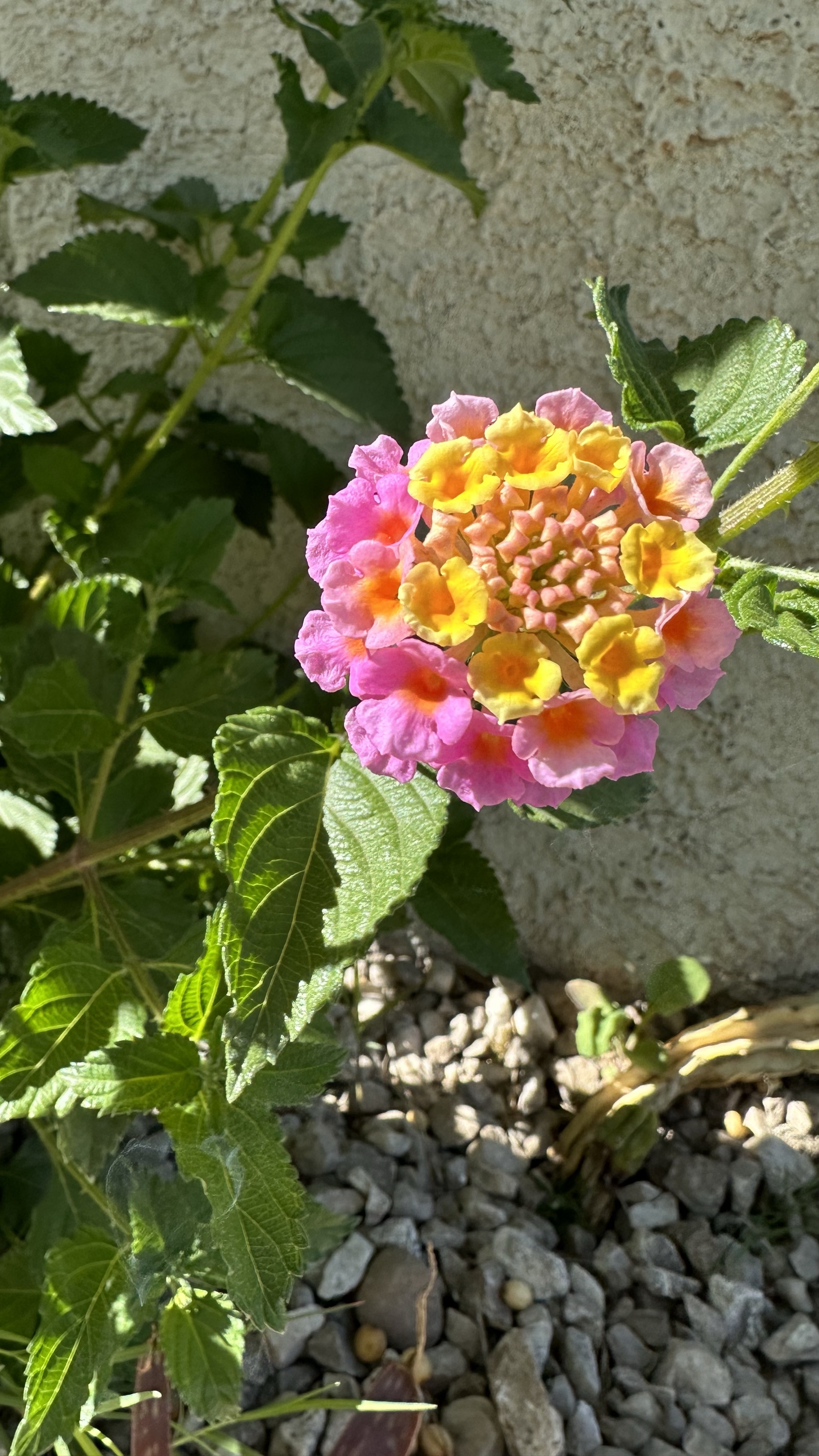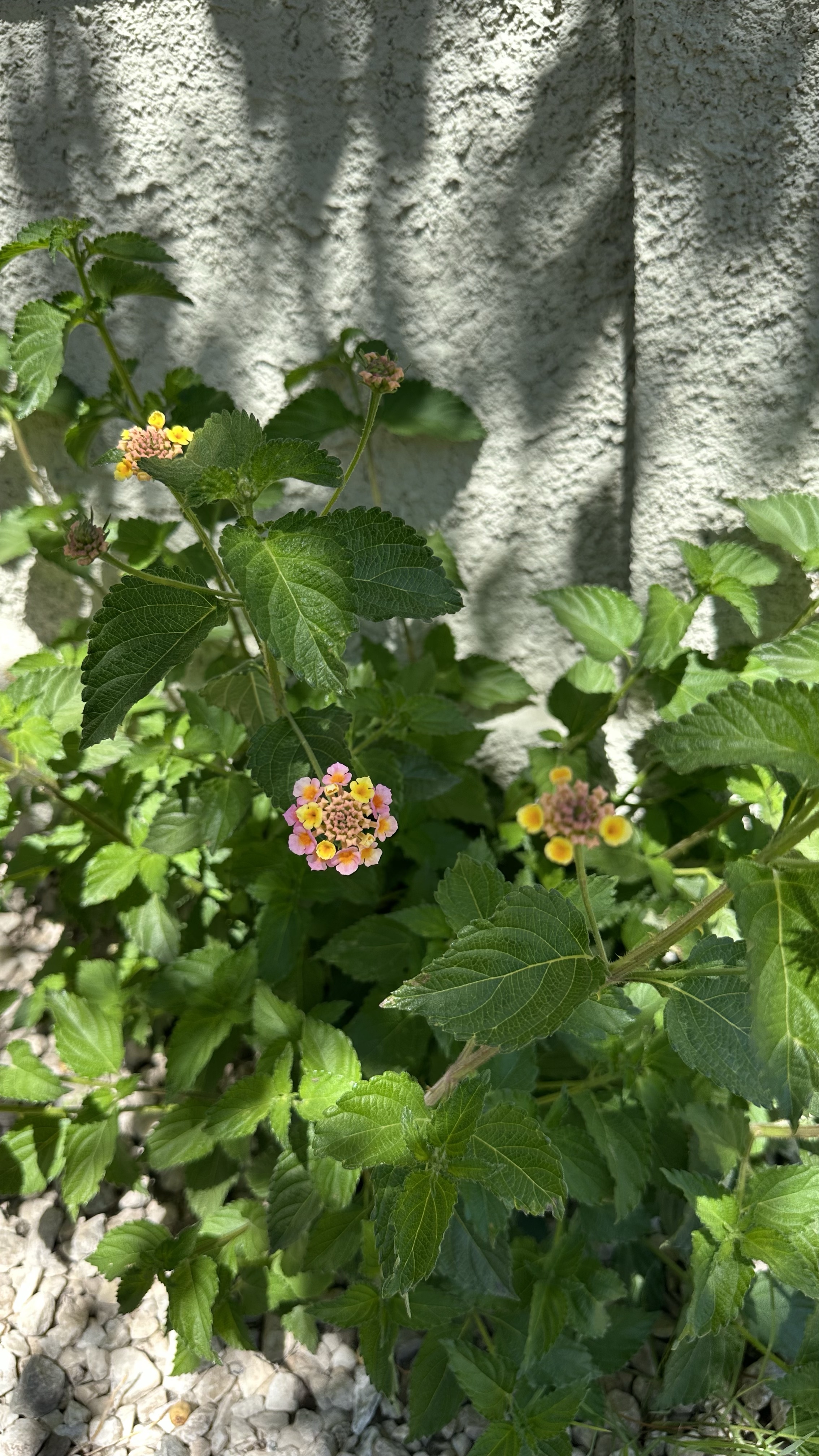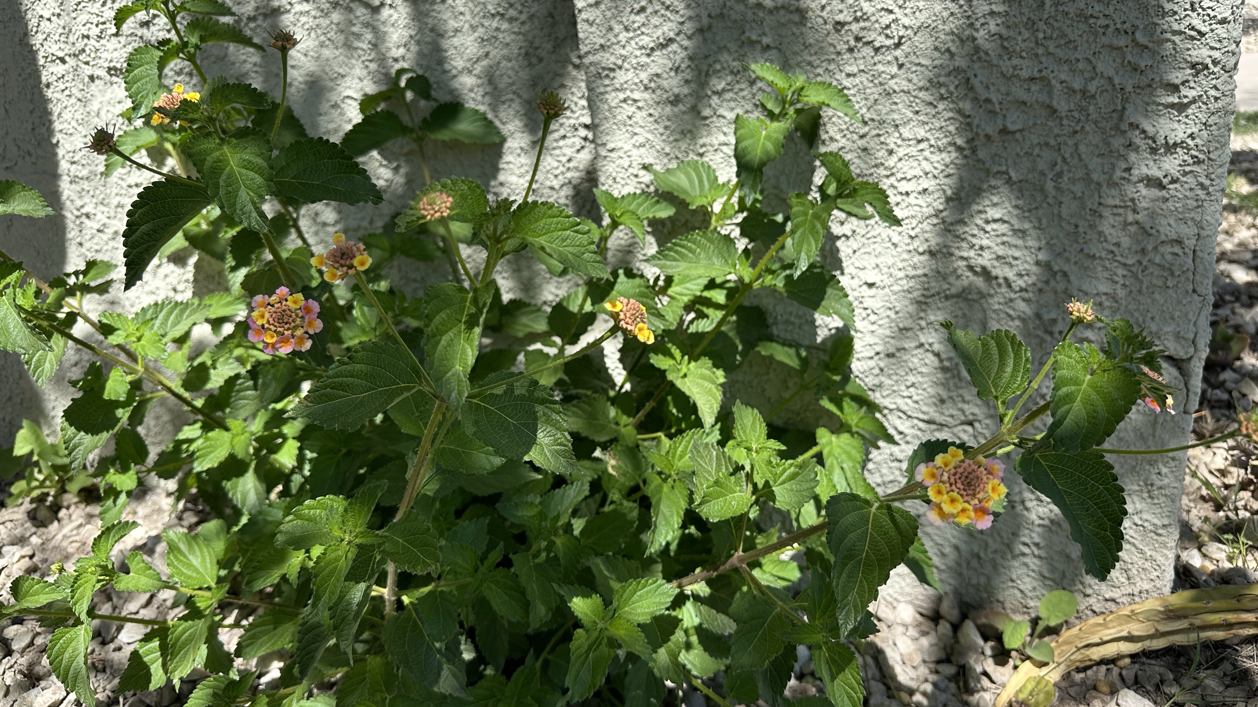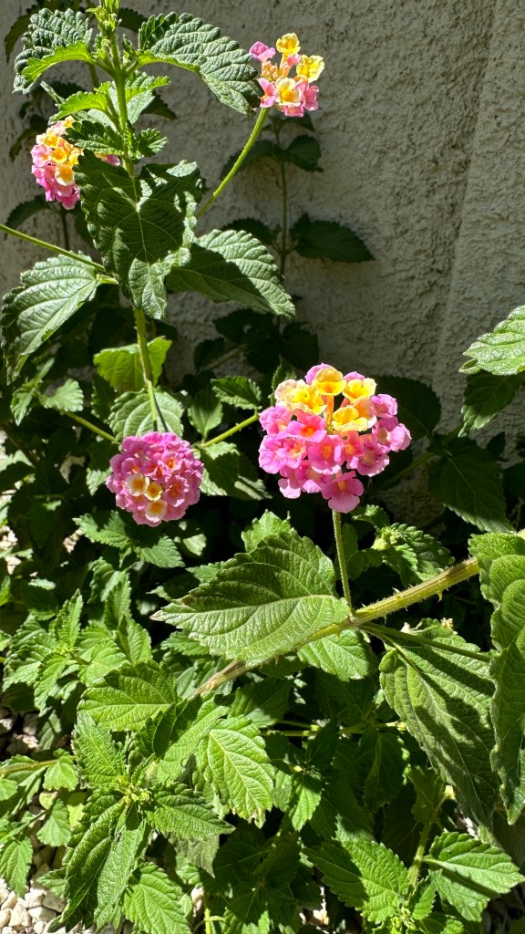 Second, they reminded me of perennials I’ve planted in Michigan, so I figured this was just an escapee from a cultivated plant. They also reminded me of Butterfly Bush (Buddleia), same flowers; similar leaves; I’ve planted globular yellow Butterfly Bushes (Buddleia globosa, native to Argentina and Chile)…. But apparently these area a different species. They’re nearly native: they come from the tropical Americas and have spread from there mostly along coastlines. I see them in many yards around Tucson; in my own yard, in addition to this one, there’s a much younger second bush a few feet away and a third, new this season, a few feet from the second huddled against a low-growing palm. I’m fairly certain that all three of these are descendant from a much larger Lantana that got chopped down (along with nearly every other living thing on this property before I signed the lease), but this, too, is sending up fresh shoots!