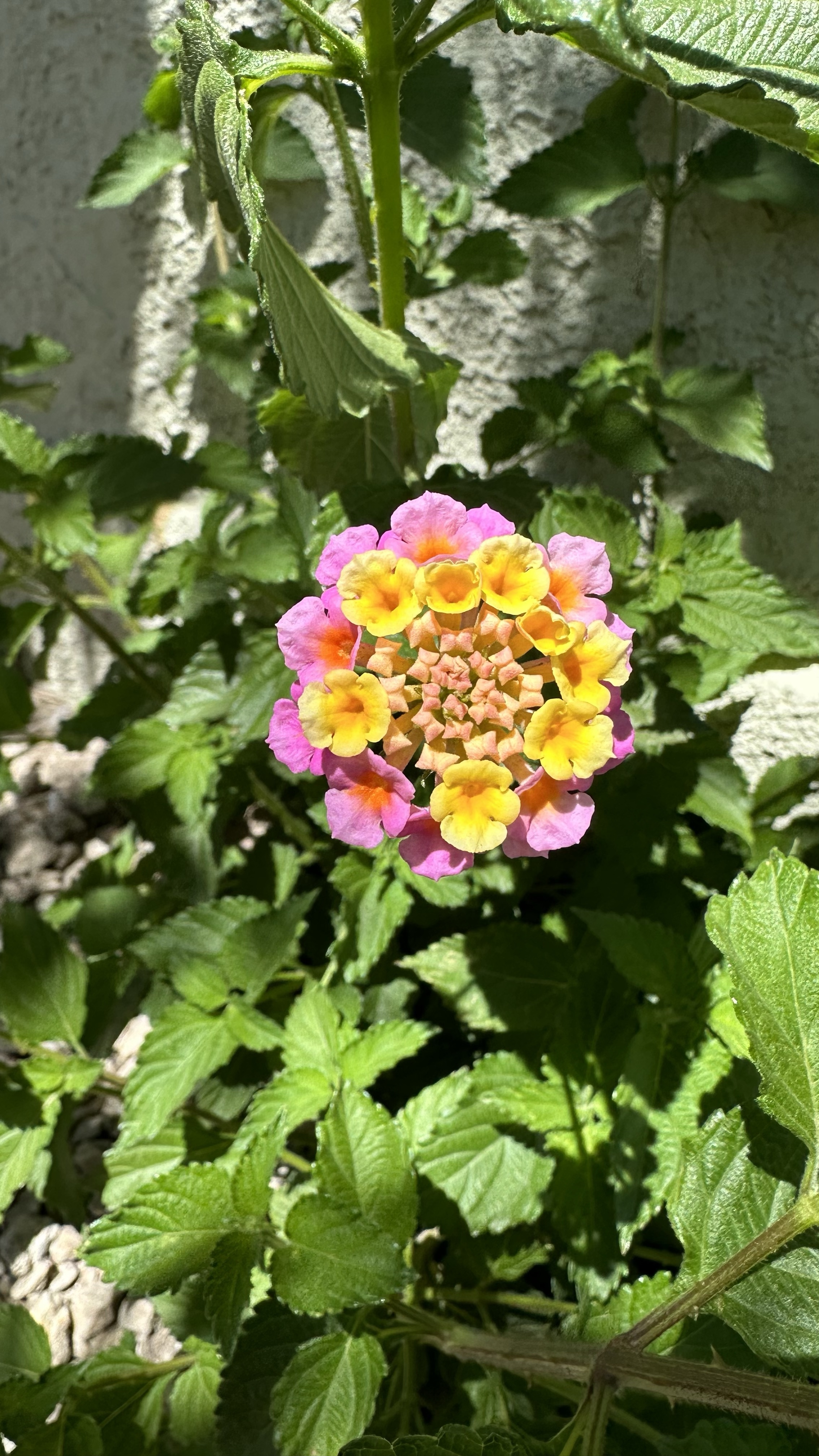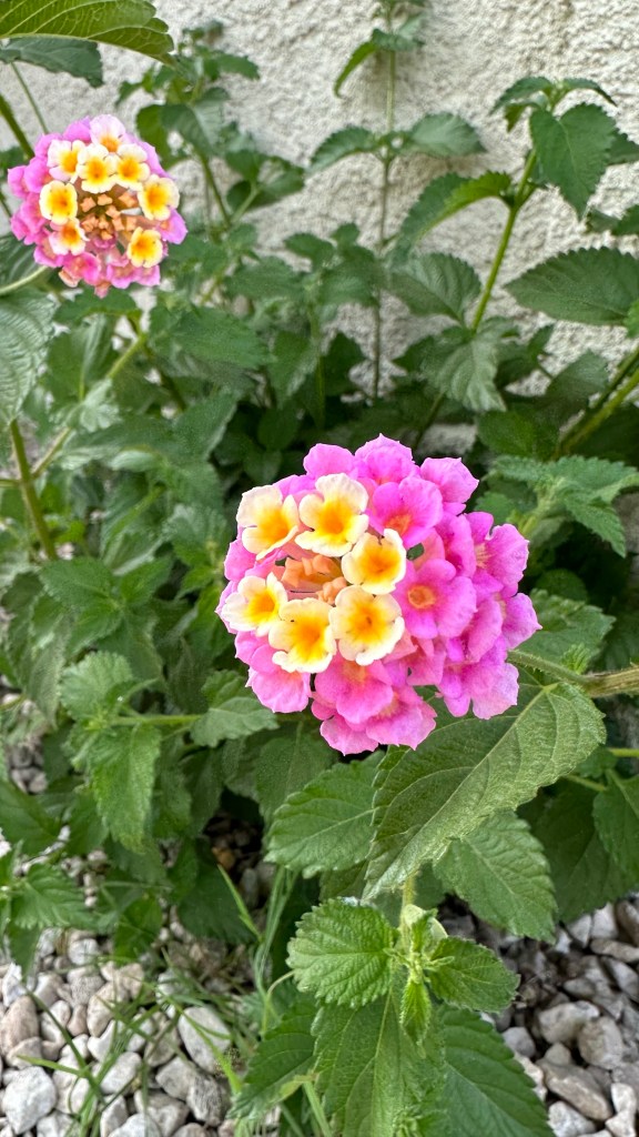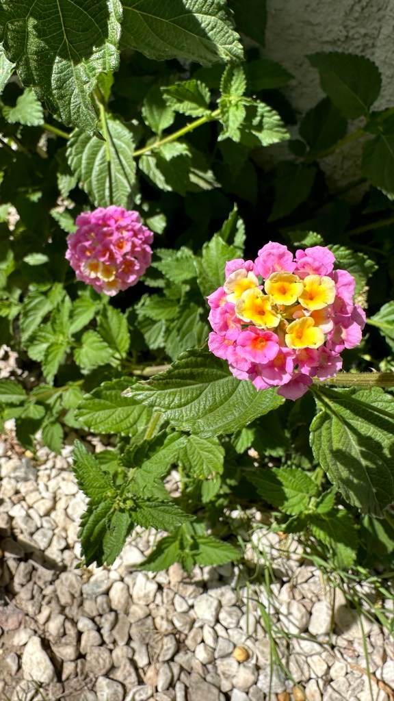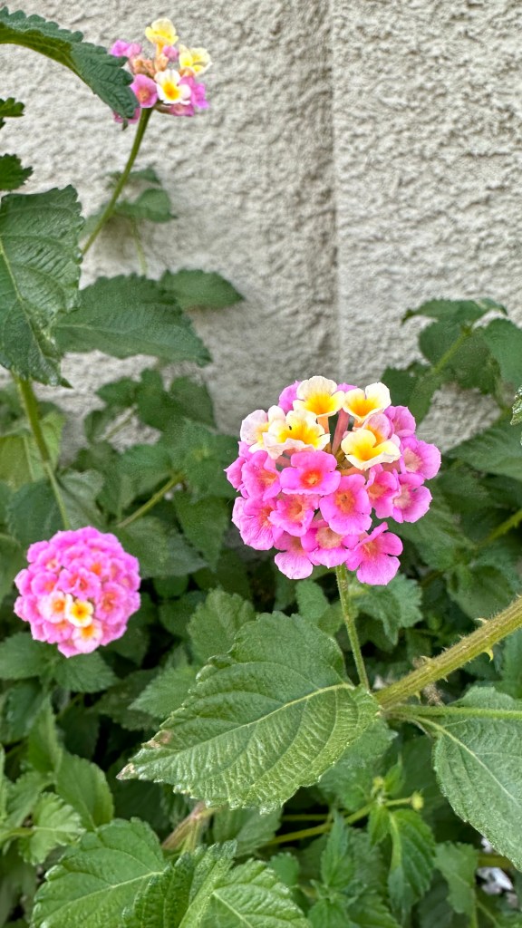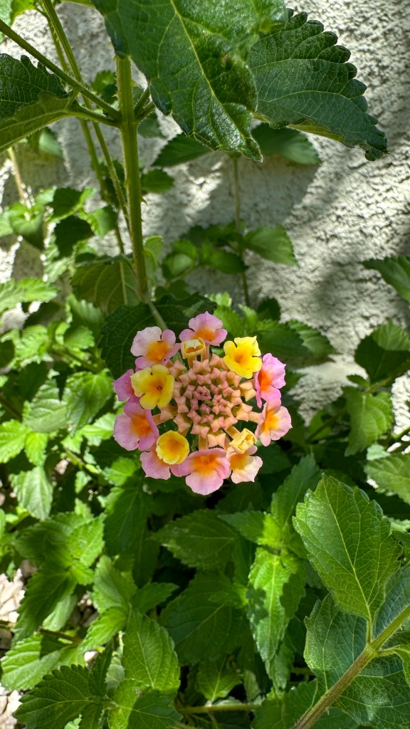 Lantana camara is actually much more interesting than I’d assumed. First of all, I’d been pretty confused about what brought about the shift in color. They’d started out mostly yellow and then I noticed they were suddenly mostly pink. I was hypothesizing it had something to do with temperature because there was a dramatic shift over the week or so when they started blooming. Turns out new blooms are yellow; once they’ve been pollinated, they turn pink. What helpful flowers! ‘Don’t waste your time, dear Bees! Come to these yellow flowers!’ I suppose that gets more potentially viable pollen into the right flowers at the right time, instead of all the good pollen being rubbed off on flowers already fertilized. These apparently come in different colors, but all the ones I’ve seen around me are the same as this one.