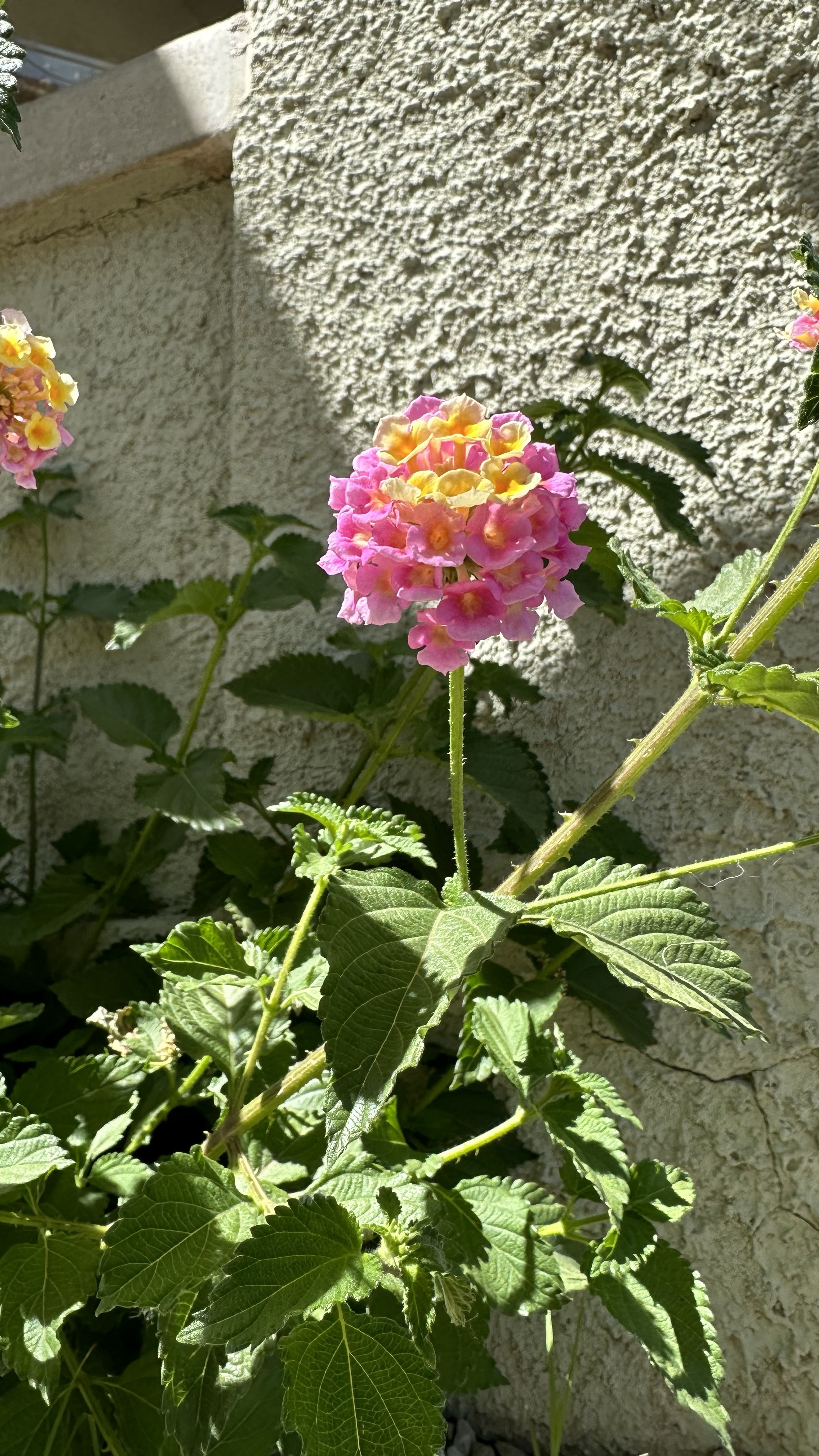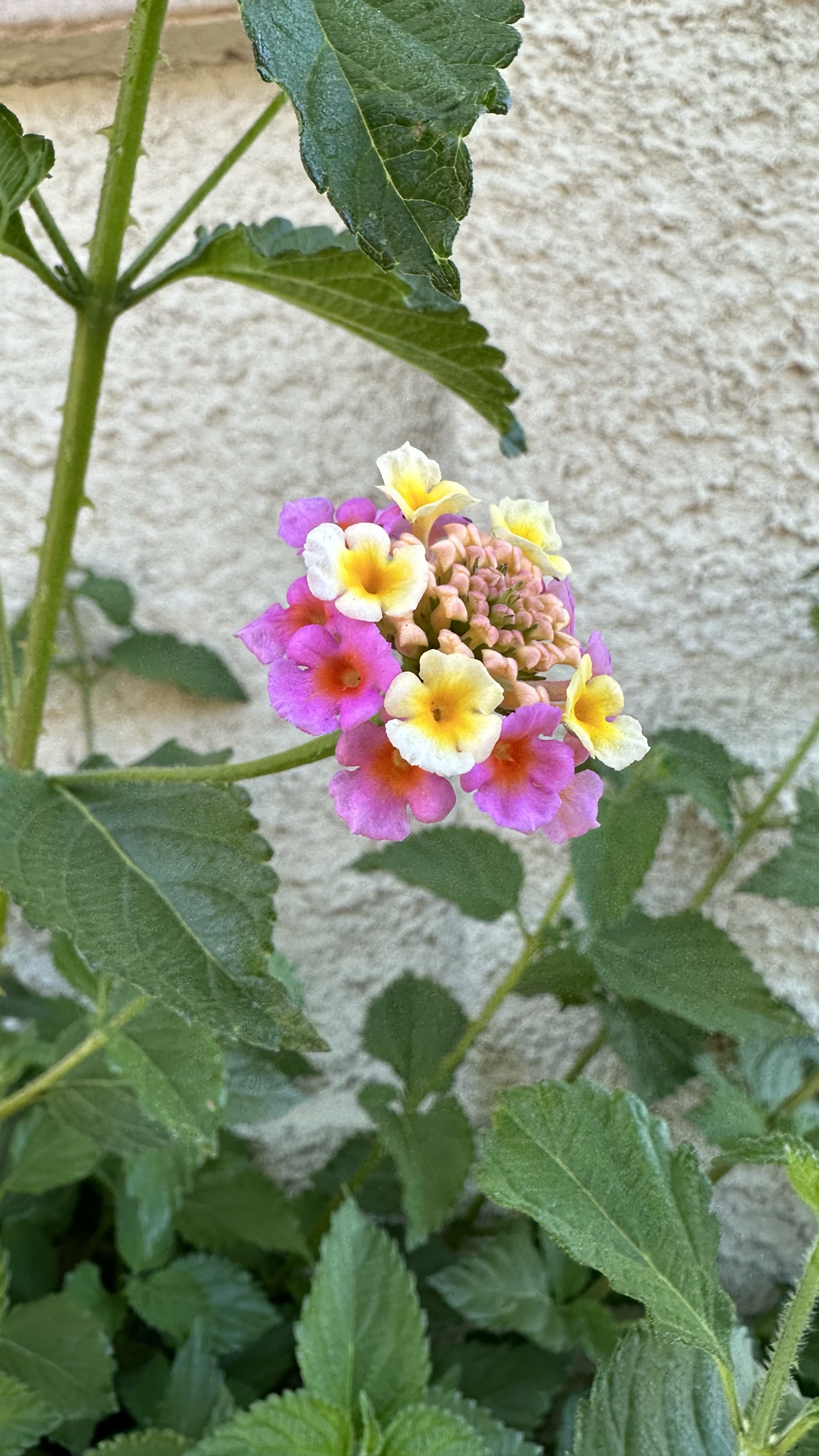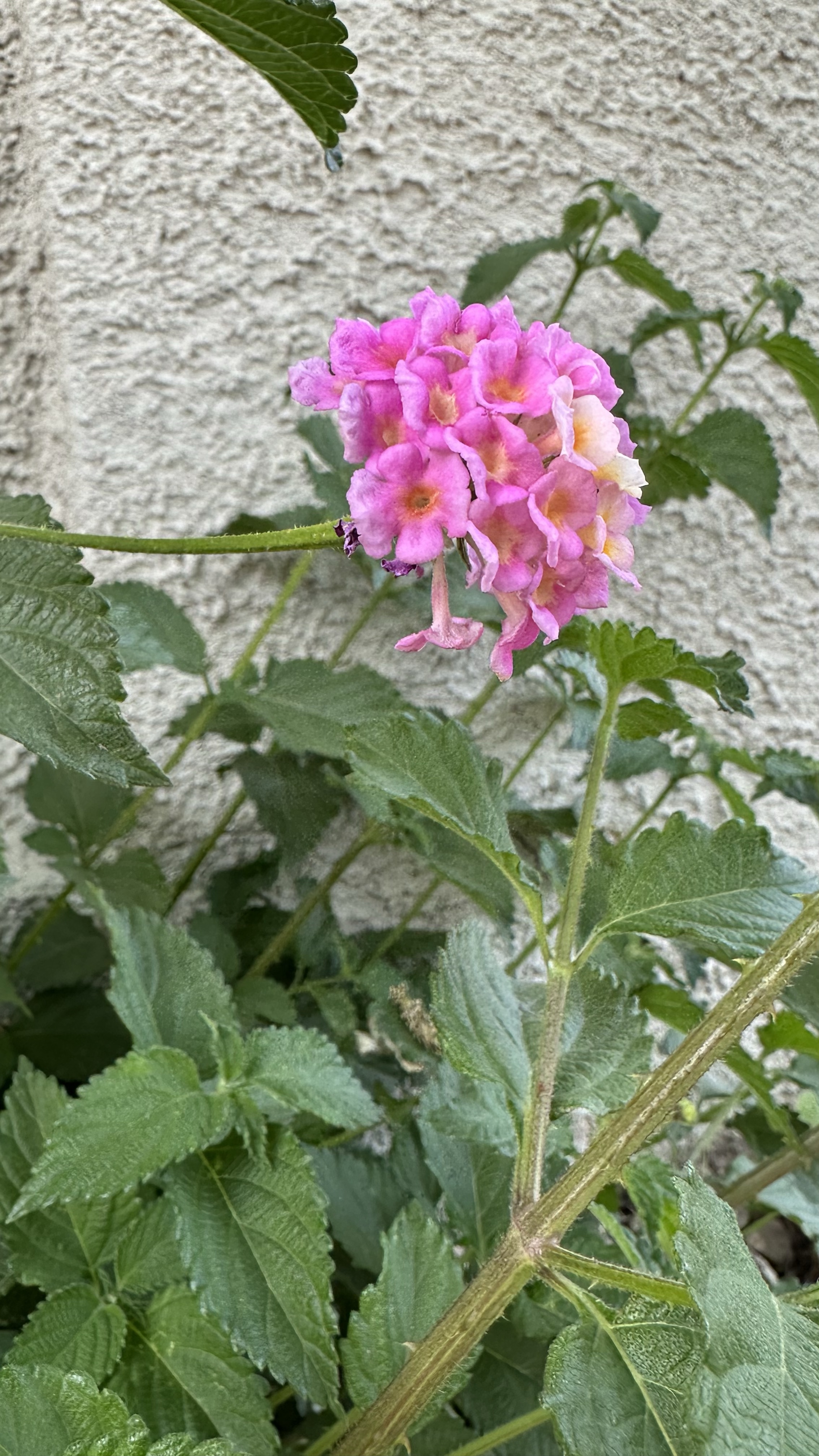 Lantana camara is actually much more interesting than I’d assumed. First of all, I’d been pretty confused about what brought about the shift in color. They’d started out mostly yellow and then I noticed they were suddenly mostly pink. I was hypothesizing it had something to do with temperature because there was a dramatic shift over the week or so when they started blooming. Turns out new blooms are yellow; once they’ve been pollinated, they turn pink. What helpful flowers! ‘Don’t waste your time, dear Bees! Come to these yellow flowers!’ I suppose that gets more potentially viable pollen into the right flowers at the right time, instead of all the good pollen being rubbed off on flowers already fertilized. These apparently come in different colors, but all the ones I’ve seen around me are the same as this one.