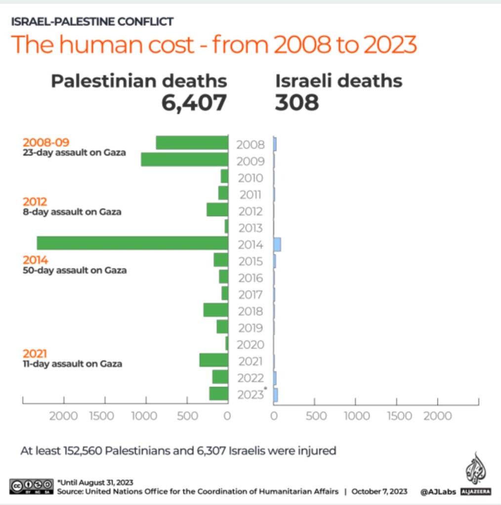 And while it is truly awful what happened at that all-night rave, who in the hell thought it would be chill to put on an all-night rave near the heavily militarized perimeter of Gaza? At best that rave was sheer hubris, but there is a clear unspoken note here of antagonizing those Palestinians the Israelis have caged into Gaza. That is how terrorism works in part, just like in the US white supremacy was and is experienced through small acts of aggression that aren’t so egregious they are able to maintain an aura of plausible deniability.