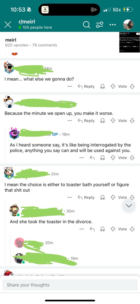 And I know it feels ridiculous to write about the problems of being a man when we’ve all been conditioned to think being a man is the best you could be, but at least hear me out. (And yes, we do raise girls to think men are the best because we raise our girls to be men’s equals rather than, eg, to be the bar that men must meet.) This is especially important for women, but men reading this will find some of their struggles recognized here.